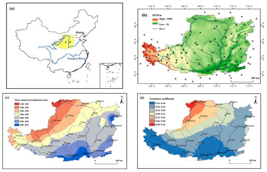 (a) The geographical location of the Loess Plateau, (b) the digital elevation model map of the study area, (c) the distribution of mean annual precipitation, and (d) the distribution characteristics of variation coefficient of annual precipitation across the Loess Plateau from 1957 to 2018.