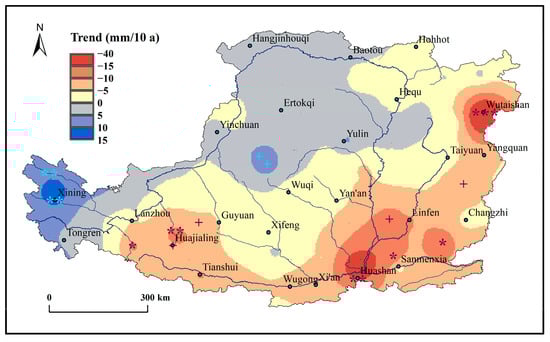 The mean annual change trend of seasonal rainfall (mm/a) over the Loess Plateau, China.