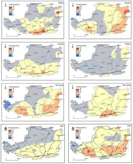 Spatial trends in precipitation for the eight sub-annual periods, namely spring, summer, autumn, winter, wet season, dry season, EFP and LFP. The blue symbols represent increasing trend and the red represent decreasing trend. The symbols of +, *, **, *** mean passing the significance level of 0.1, 0.05, 0.01, and 0.001, respectively. The symbols of ***** represents the significance of the two adjacent stations.