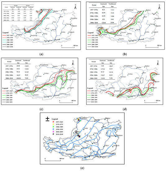 Isohyets and centroids at decade-scale between 1957 and 2018 over the Loess Plateau, China. The centroids of isohyets of the 150, 250, 350, 450 and 550 mm are expressed by the triangle, star, diamond, circle and square, respectively. (a) The 150 and 250 mm isohyets and shift distance; (b) the 350 mm isohyet and shift distance; (c) the 450 mm isohyets and shift distance; (d) the 550-mm isohyets and shift distance; (e) the isohyets of mean annual precipitation and locations of the centroids of isohyets.