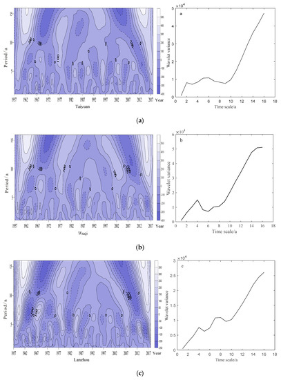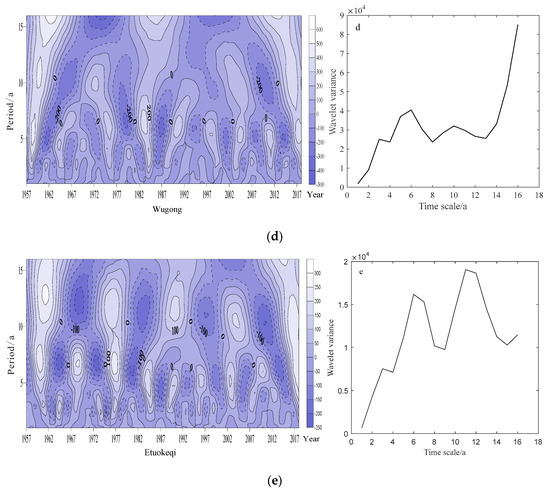 Transform coefficient of Morlet wavelet real contour and wavelet variance of Taiyuan (a) Wuqi (b), Lanzhou (c), Wugong (d), and Etuokeqi (e) stations.