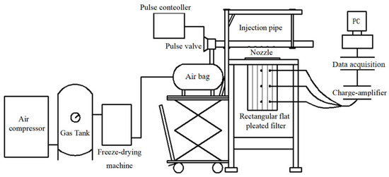 Figure 2 shows the schematic diagram of the pulse jet test bench consisting of a gas supply system, jet system and pressure test system. The gas supply system consisted of a HAD-1SNF freeze-drying machine, WW-0.9/10B-Q air compressor, and gas tank. The jet system consisted of SXC-8A1 pulse controller, 24 L air bag (wall thickness: 7.5 mm), DMF-ZM-25 1” solenoid valve, jet pipe (Length: 1200 mm. Diameter: 28 mm), rectangular flat cartridge (length: 470 mm, width: 64 mm, height: 1000 mm, pleat depth: 31 mm, 33 pleats at a single side, filtration area: 4.3 m2), etc. The pressure test system consisted of a charge-amplifier and the data acquisition system. The test data acquisition system consisted of six pressure transducers, a charge-amplifier, a data acquisition instrument and a computer (with OSA software). The acquisition accuracy of the high-sensitivity pressure sensor was 0.1 Pa.