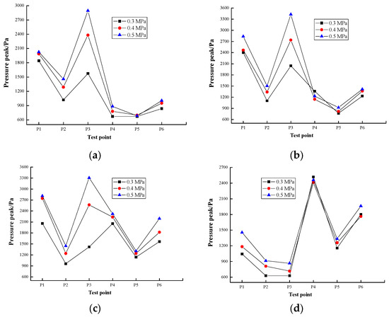 It can be seen from Figure 4a that, with increasing jet distance, the peak pressure at the nozzle with a total nozzle area of 273 mm2 increased first and then decreased. Moreover, an opposite nozzle had greater peak pressure than a non-positive nozzle. P4 had the smallest peak pressure at the jet distance below 20 mm because the gas flow from the nozzle did not cover the upper part of the non-positive nozzle at a small jet distance. With increasing jet distance, the gas flow gradually diffused and induced more gas to enter the flat cartridge. At the jet distance above 40 mm, the peak pressures at all reference points began to decrease since, at a large jet distance, more jet gas flow escaped outside the flat cartridge during diffusion and thus the gas flow obtained by the flat cartridge reduced.