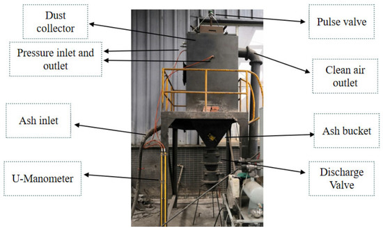 To evaluate the rationality of using integrated pressure to evaluate the effect of dust cleaning, it was verified using an industrial dust experiment. The industrial dust test system consisted of a dust collector, DMF-ZM-25 1” pulse valve, discharge valve, ash bucket and U-manometer, as shown in Figure 6.