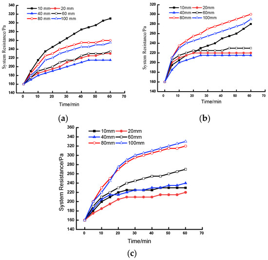 It shows that the flat cartridge has small system operation resistance, not more than 350 Pa. It can also be seen from Figure 7a that the cartridge had the lowest operation resistance at the jet distance of 40 mm and the operation resistance of the cartridge plateaus within 45 min at different jet distances. At the jet distance of 10 mm, the system operation resistance was large and rising. According to the pulse jet test results, P4 had low peak pressure at the jet distance of 10 mm, so the cleaning uniformity was poor.