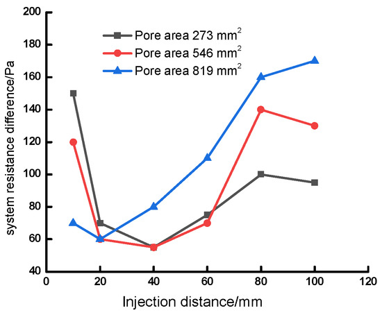 Figure 11 and Figure 12 show the system resistance difference and dust residue of the nozzles with different areas at different jet distances at the pulse pressure of 0.4 MPa, respectively.