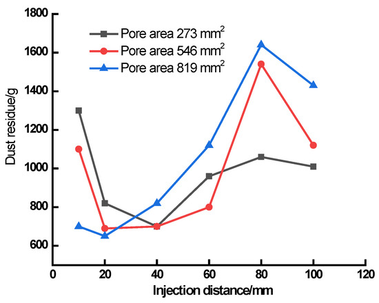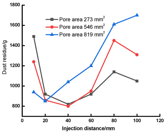 The dust residue of the cartridge with different nozzle areas and different jet distances at the pulse pressure of 0.4 MPa.