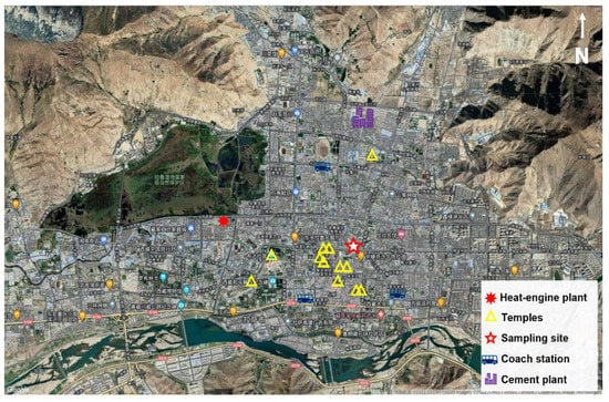 Size-segregated particulate matter samples were collected on the rooftop, 18 m above ground level of the Tibet Meteorological Bureau (29°39′ N, 91°08′ E, 3679 m a.s.l.). The Bureau is in a commercial sector of Lhasa characterized by relatively high traffic. It is surrounded by residential buildings, schools, hospitals, passenger stations, and temples. The Potala Palace, Ramoche Temple, and other famous tourist attractions were on the south of the sampling site. Regarding industrial emission sources, a coal-fueled power plant and several cement plants were in the proximity of the sampling site (shown in Figure 1).