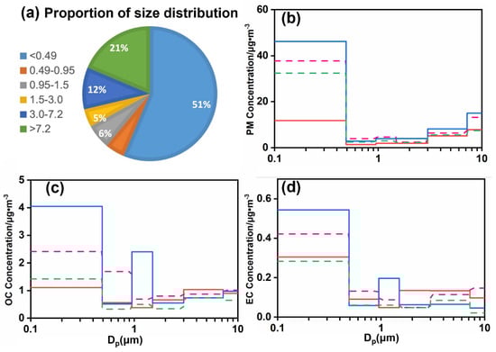 EC comes mainly from primary pollution sources such as vehicle exhaust, the incomplete combustion of coal, and biomass [16,33], which are basically smaller than 0.2 μm. Therefore, EC was distributed mainly in the PM smaller than 0.49 μm.