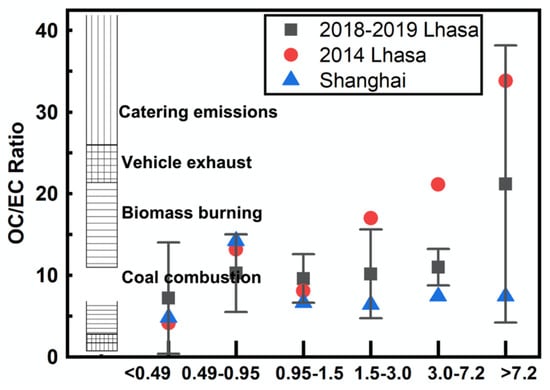 The ratio of OC to EC is an important diagnostic indicator to demonstrate emission sources, secondary organic aerosol (SOA) formation, and different removal rates [37]. When the ratio of OC to EC exceeds 2, it indicates the formation of SOC. The larger the OC−EC ratios, the higher the concentration of SOC [25,38]. The characteristic ranges of OC−EC rations for motor vehicle exhaust (1.0–4.2) [39], coal burning (2.5–10.5) [40], biomass combustion (3.8–13.2 and 16.8–40.0) [41], cater emissions (32.9–81.6) [42], and suspended dust (13.1) [43] were given in the previous studies. The OC−EC ratios are greater than 2, indicating secondary pollution formation in Lhasa, as shown in Figure 3. In comparison with the other studies, the OC−EC ratios in Lhasa and Shanghai [44] are relatively consistent, at < 0.49 μm, 0.49–0.95 μm, and 0.95–1.5 μm (Figure 4).