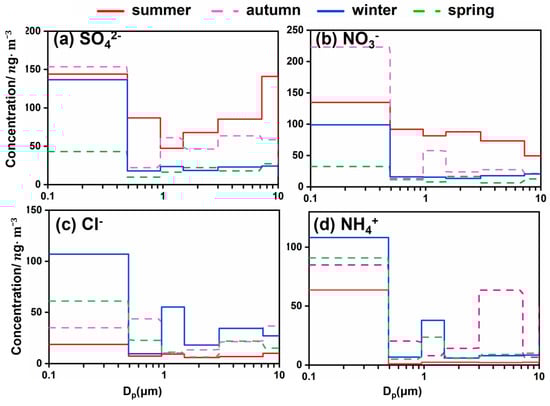 NH4+, Cl−, SO42−, and NO3− were the main water-soluble ions in PM in Lhasa [47]. Moreover, sulfates and nitrates in the atmosphere are more likely to come from the secondary conversion process [48], and we deduced stronger solar radiation causing more secondary pollution in Lhasa. The size distribution and seasonal variation of WSIs in Lhasa are shown in Figure 5. NH4+, Cl−, SO42−, and NO3− exhibited bimodal distributions: the concentration reached its maximum at <0.49 μm and peaked at 0.95−1.5 μm or >3.0 μm.