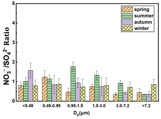 Size distribution of [NO3−]−[SO42−] ratio during different seasons.