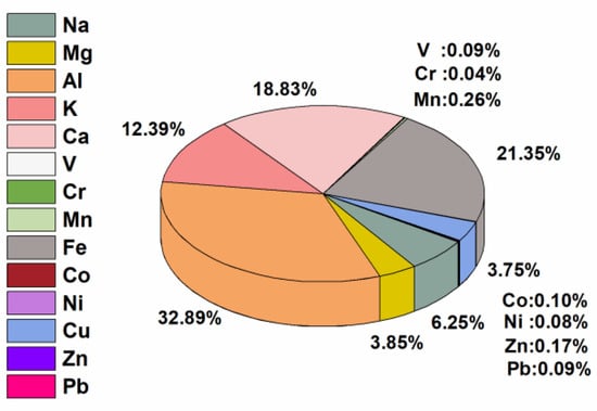 In this study, among the 14 trace elements, Al (1.86 ± 0.6 μg/m3, 32.8%) was the most abundant species, followed by Fe (1.21 ± 0.4 μg/m3, 21.3%), Ca (1.06 ± 0.35 μg/m3, 18.8%), K (0.7 ± 0.4 μg/m3, 12.4%), Na (0.35 ± 0.13 μg/m3 6.3%), Mg (0.218 ± 0.07 μg/m3, 3.8%), and Cu (0.21 ± 0.07 μg/m3, 3.7%) in total metal concentration in TSP (Figure 7). These seven metal species constituted 99% of the total metal concentrations, whereas the other seven metal species constituted 1% of the metal concentration in TSP. The concentrations of As and Cd were close to zero; the concentrations of V and Cr were also negligible, which indicated that the heavy industry [57,58,59] was underdeveloped in Lhasa and that no smelter, boiler plant, or other production activities were near the sampling point.