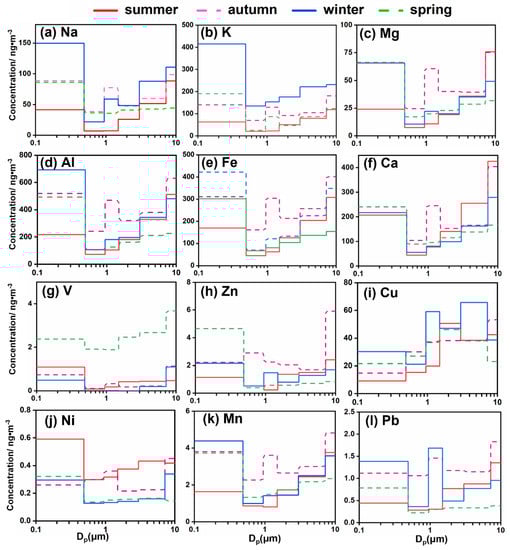 Except for Co and Cr, the 12 trace elements were considered to be significant in this study, as shown in Figure 8. Na, Al, Mg, and K exhibited typical bimodal distributions with similar seasonal variations. These species exhibited maximal concentrations at <0.49 μm (in winter and spring) and >7.2 μm in summer (Figure 8). We inferred that the abundance of K smaller than <0.49 μm is from the biomass burning with wood and cow dung for heating [60,61]. Moreover, suspended soil contributed more in summer compared with biomass burning, where Na, Al, Mg, and K were important crustal elements [62].