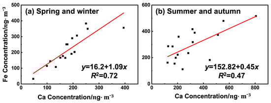 The correlation of Ca and Fe concentration (PM3-10) during different seasons: (a) spring and winter; (b) summer and autumn;.