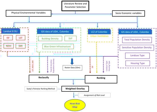 All the gathered spatial data were processed in a common GIS platform and geographical boundary (administrative wards of the Colombo Municipal Council). All raster were resampled to 10 m from the original 30 m resolution, as explained in Appendix A. The vector data (LCZ, building footprint, green–blue infrastructure and socioeconomic data) within administrative wards were assigned equally to 10 m resolution to bring all data to a common resolution. The satellite image for the Colombo area was obtained on 13 Jan 2017, when the cloud cover was minimal (less than 2.9% of the map area). We used the WGS 84 UTM 44 N projection system for this step. Table 3 and Table 4 show data transformation into usable output layers for the heat risk map. Appendix A provides further details on resampling, LST and NDVI calculations, relevant equations, and normalisation procedures.
