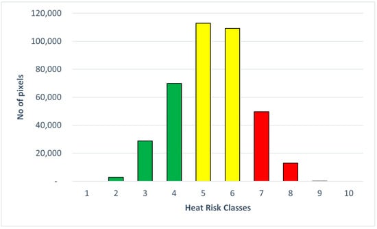After processing all the data, we finally reclassified them on a scale of 1 to 10. The scale indicated an order of heat risk, where 1 was considered the lowest heat risk and 10 was considered the highest risk. Continuous data (LST, NDVI, etc.) were grouped into ten groups of equal intervals, and risk classes (1–10) were assigned on the basis of the assumptions specified in Table 1 and Table 2. Discrete data (such as land use, housing type, etc.) were assigned risk classes according to expert opinion (Table 8, Table 9 and Table 10). We then used the weighted overlay tool in ArcMAP to combine all twelve chosen variables. This produced a heat risk map divided into the said ten classes of heat risk. Since the distribution of heat risk was normal (see Figure 3) we characterised the median range (5–6) as ‘moderate’ heat risk, while the two extremities (1–4 and 8–10) were classified as ‘low’ and ‘high’ heat risk, respectively. The ArcMAP mapping process using model builder is shown in Figure 4.