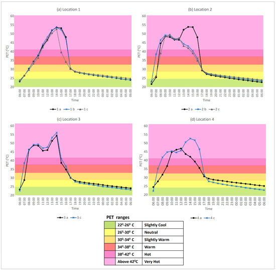 PET is defined as the air temperature in which the heat budget of the human body is balanced in a typical indoor setting (without wind and solar radiation) with the same core and skin temperature as under the complex outdoor conditions to be assessed [60]. ENVI-met provides PET data at selected points and RayMan software was used to calculate the variations in PET over 24 h. Using the MRT information from ENVI-met, we calculated PET for spot analysis of heat stress in the middle of each of the studied domains.