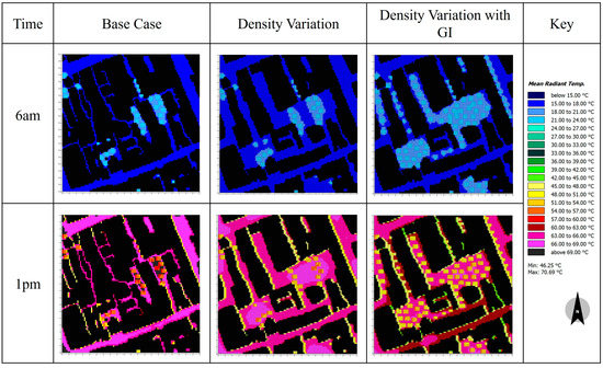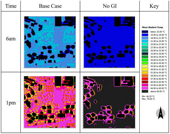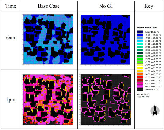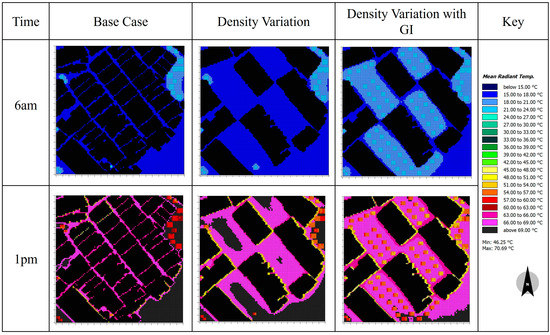 Heat stress, especially in tropical outdoor conditions, is notoriously difficult to quantify. No thermal comfort index is fully able to explain heat stress under hot, humid conditions [58]. Among those widely used in hot, humid climates, PET appears to be the most common, especially its modified version which also includes thresholds for tropical heat stress [59]. We used two indicators: MRT and PET. MRT assumes greater importance among these parameters, especially in conditions of high solar angles [60]. MRT, defined as the uniform temperature of an imaginary enclosure in which the radiant heat transfer from the human body equals the radiant heat transfer in the actual non-uniform enclosure [61] is also critical in calculating thermal indices such as PET [62] and UTCI [63]. Given that detailed spatial distribution of heat stress information from ENVI-met is available in MRT, we used MRT as the analysis parameter for spatial analysis of heat stress. MRT is a good proxy for outdoor comfort and is extensively used in the literature [64].