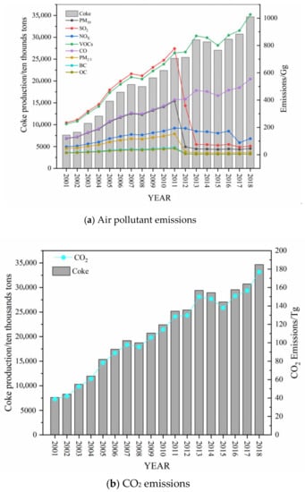 Based the calculations, this paper obtained details of the production of coke and the emission of pollutants (i.e., PM10, SO2, NOX, VOCS, CO, PM2.5, BC, and OC) during 2001–2018. Detailed analysis of these results considered the aspects of temporal trends, spatial distribution, coking procedures and the air pollutant emissions in different scenarios.