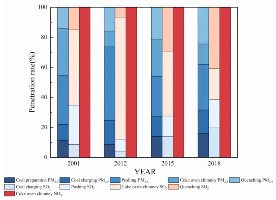 X emissions associated with five components (coal preparation, coal charging, coke pushing, the coke oven chimney, and quenching) of the procedures conducted by independent coking industry in 2001, 2012, 2015, and 2018. According to the estimates, from 2001 to 2018, the emissions associated with the various components of the procedures decreased substantially. The SO
