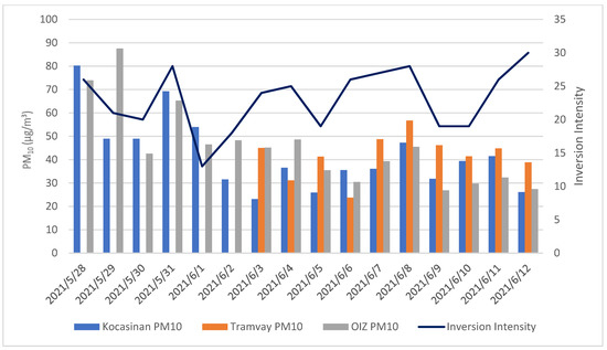 PM10 daily concentrations at Kayseri sampling points and inversion intensity (spring period).