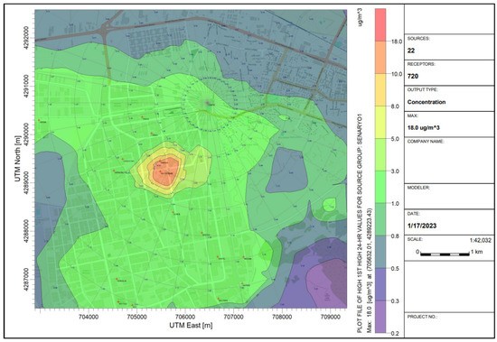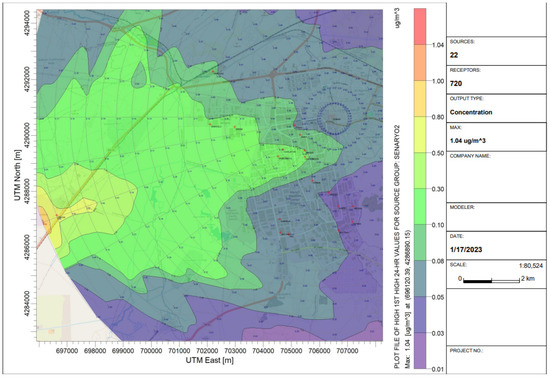 The PM10 modeled values of 18.0 and 3.0 μg/m3 are very different from the PM10 sampled values in Figure 3. Only some specific industrial point sources were considered in the model, ignoring the contribution of other important emission sources as traffic and residential heating. The modeled 1 h and 24 h PM10 levels, peak receptor coordinates, and peak dates/hour are presented in Table 4.