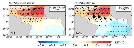 The spatial pattern of the AMM is generally obtained by applying an SVD analysis between monthly SST and surface wind stress or 10 m wind anomalies in the tropical Atlantic [4,40]. It is shown that the spatial pattern of the AMM obtained from the surface wind stress anomalies is basically consistent with that obtained from the 10 m wind anomalies (Figure 1a vs. Figure 1b), except that the corresponding SST anomalies in the southern tropical Atlantic are a bit more pronounced when using the 10 m wind. Due to the unavailability of 10 m wind output for some models, surface wind stress is used to obtain the AMM for both observations and model simulations in this study. Indeed, the SST anomalies in the northern tropical Atlantic are highly independent of those in the south at interannual time scale (e.g., [11,47,48,49]).