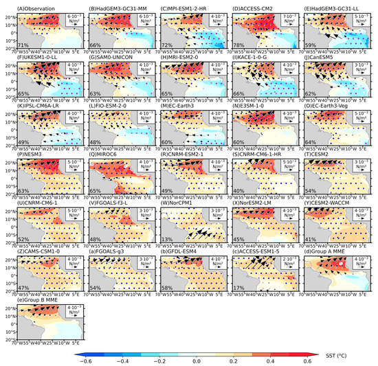 The results emerging from Figure 2 and Figure 3 suggest that, although most of the CMIP6 models can reasonably capture the spatial pattern of the AMM similar to the observed one, some models fail to reproduce the associated wind–SST relationship. To explore the possible causes, two groups of models are selected for comparison based on a criterion to measure the wind–SST relationship. We calculated the difference in the SST variances (see Figure 3) between the month of the peak and the month preceding the peak by two months, and the ones with the largest difference represent a more similar observed wind–SST relationship and vice versa. The first six models with the largest differences in the SST variances are selected as the ones (referred to as group A) that can capture the observed spatial pattern of the AMM and the associated wind–SST relationship. In contrast, the models with a small difference in the SST variances are chosen as the ones (referred to as group B) that can capture the observed spatial pattern of the AMM but not the wind–SST relationship. There are five models in group A, namely HadGEM3-GC31-MM, MRI-ESM2-0, CNRM-CM6-1-HR, KACE-1-0-G, ACCESS-CM2 and MIROC6, and those in group B include FIO-ESM-2-0, UKESM1-0-LL, IPSL-CM6A-LR, EC-Earth3-Veg and NorESM2-LM. As shown in Figure 1e,f, the spatial patterns of the AMM for the multi-model ensemble (MME) average of group A and B both resemble the observed one well. Note here that linear regression coefficients are calculated for the individual models prior to the MME average. Moreover, the wind–SST relationship for group A (Figure 3e) is also consistent with the observed one, but for group B (Figure 3F), the month-to-month variation in the SST is relatively flat and obviously different to that for group A.