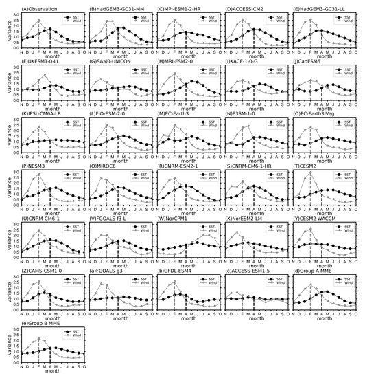 Month-by-month variance of the AMM-related wind stress (gray curve) and SST (black curve) anomalies in the (A) observation, (B–c) individual CMIP6 models and multi-model ensemble average for (d) group A and (e) group B. Dashed gray and black lines denote the month corresponding to the peak in the observed wind and SST, respectively.