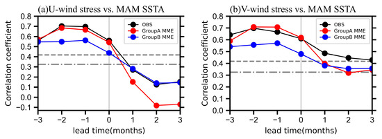 Lead–lag correlation coefficients of the spring NTA index with the NTA-regional-averaged (a) zonal and (b) meridional components of wind stress for the observations (black), MME average of group A (red) and group B (blue). The dashed and dashed-dotted lines denote significance at the 99% and 95% confidence levels, respectively. The lead time refers to the middle month of the 3-month-running season, and negative values indicate that the wind stress is leading.