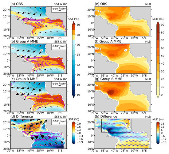 A question arises as to why the models in group B underestimate the AMM-related wind–SST relationship in the northern tropical Atlantic. To answer this question, mean states of the tropical Atlantic for group A and B are compared since the SST response to the wind stress forcing is modulated by the background state (e.g., [36,51,52]). Figure 6 displays the climatological means of SST and mixed layer depth in spring and surface wind stress and precipitation in the previous winter (January–February–March). Compared to those in group A, the models in group B show stronger mean trade winds and colder SSTs over the northern tropical Atlantic. The mean precipitation in group A is heavier in the deep tropical Atlantic than that in group B, which is consistent with the convergence of the mean wind there. In other words, the tropical Atlantic Intertropical Convergence Zone (ITCZ) is stronger in group A than in group B. It will be indicated later in Figure 7 and Figure 8 that almost all the models in group A show a stronger ocean–atmosphere coupling compared to those in group B. Therefore, our result is consistent with previous studies that found the stronger climatological ITCZ benefits a stronger ocean–atmosphere coupling in the tropics [53,54]. Meanwhile, the mean mixed layer depth in the northern tropical Atlantic simulated by the models in group B is deeper than that for group A, which is consistent with the stronger trade winds simulated by the former. The stronger trade winds and thus the stronger stir on the ocean could result in a thicker mixed layer. The mixed layer is an important interface for material exchange between the atmosphere and the ocean. According to the SST tendency equation, the variation in SST is inversely proportional to that in the mixed layer depth [55,56]. In other words, when the heat flux is constant, a shallower mixed layer depth corresponds to a larger fluctuation in the SST and vice versa. Therefore, the stronger mean trade winds and thus deeper mean mixed layer contribute to the underestimation of the wind–SST relationship in the northern tropical Atlantic for group B when compared to group A.