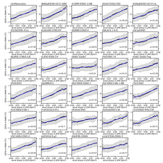 Figure 3 shows the month-by-month variance in the expansion coefficients of the wind stress and SST anomalies associated with the AMM in the observations and individual models. It is indicated that the variance in wind stress anomalies peaks in February, while that of the SST anomalies peaks in the following April, which is consistent with the WES feedback that variation in the AMM-related wind stress leads that in the SST [6,9]. However, the simulated wind–SST relationship varies among the models. Some models, such as HadGEM3-GC31-MM, MPI-ESM1-2-HR, ACCESS-CM2, HadGEM3-GC31-LL, MRI-ESM2-0, KACE-1-0-G, NESM3, MIROC6, CNRM-ESM2-1, CNRM-CM6-1-HR, CNRM-CM6-1, FGOALS-f3-L and CAMS-CSM1-0, have a peak in the wind and SST variances in spring, with a lead of the wind over the SST, implying that the simulated wind–SST relationship is basically consistent with the observed one. In contrast, in some other models, including UKESM1-0-LL, SAM0-UNICON, IPSL-CM6A-LR, FIO-ESM-2-0, EC-Earth3-Veg, NorESM2-LM, CESM2, CESM2-WACCM, FGOALS-g3 and GFDL-ESM4, the month-to-month variation in the AMM-related SST anomalies is relatively flat and without any obvious peak, suggesting that these models fail to capture the observed wind–SST relationship associated with the AMM.