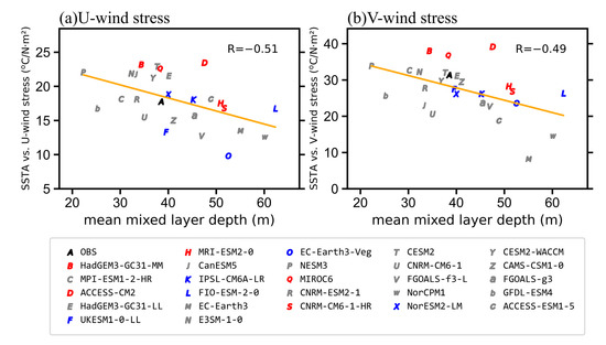 Figure 8 displays the scatter plots of the regional-averaged mean mixed layer depth versus the strength of ocean–atmosphere coupling obtained from the zonal and meridional wind stress components, respectively. Note here that SAM0-UNICON appears to be a model outlier and excluded from Figure 8. It is indicated that the strength of ocean–atmosphere coupling has a significant out-of-phase effect with the mean mixed layer depth, with a correlation coefficient reaching −0.51 (p < 0.05) and −0.49 (p < 0.05) for the zonal and meridional components of wind stress, respectively. In general, the ocean–atmosphere coupling in the models of group B is weaker than that in those of group A, consistent with the aforementioned results. This result confirms that the deeper mean mixed layer contributes to the underestimation of the wind–SST relationship in the northern tropical Atlantic in the models. Model biases in the mean mixed layer depth may be related to those in the mean northeasterly trade wind, due to stronger winds inducing more vertical mixing and entrainment [28,54,59,60], but further investigation is needed in future works.