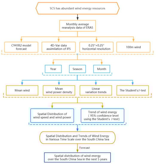 In order to clarify the spatial distribution and trends of wind energy (as measured by wind and wind power density) at various time scales over the SCS from 1979 to 2021, the ERA5 reanalysis data and statistical methods were used. The flowchart used in order to achieve the steps of this work is displayed in Figure 1. The 100 m wind of a 0.25 × 0.25 horizontal resolution from the ERA5 monthly mean reanalysis data was selected in order to calculate the wind energy, which was produced by using the 4D-Var data assimilation obtained from the CY41R2 of the ECMWF’s Integrated Forecast System (IFS) []. Firstly, the wind energy over the SCS was evaluated on three time scales: year, season, and month. These time scales were calculated using the method of the mean wind and the mean wind power density in order to reveal the spatial distribution of wind energy. Secondly, the linear regression associated with Student’s t-test was utilized to investigate the variation in trends of wind energy over the SCS. Finally, the spatial distribution of wind energy over the SCS over the next 5 years was predicted, depending on the trends in wind energy obtained.