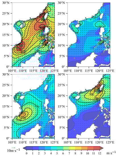 Figure 2 shows the annual mean distribution of the wind and wind power density over the SCS during 1979–2021. The northeast wind controls most areas of the SCS, indicating that the annual mean wind of the SCS is mainly dominated by the winter monsoon (i.e., the northeast wind). The annual mean wind speed ranges between 5 m·s−1 and 8 m·s−1 and is stronger than the surrounding areas. There are three strong centers, located in the Taiwan Strait, the Bashi Channel, and the southwestern SCS, wherein the annual mean wind speed values are more than 7 m·s−1. The annual mean wind power density over the SCS generally exceeds 100 W·m−2. In addition, there are three strong centers that exceed 400 W·m−2, which corresponds to a strong wind speed. The Wind Energy and Solar Energy Resources Evaluation Center of CMA in their “Detailed Survey and Evaluation of National Wind Energy” found that Inner Mongolia and Xinjiang are the provinces in China with the most abundant onshore wind energy, ranging between 100 W·m−2 and 200 W·m−2. The annual mean wind power density over the SCS is generally higher than that over most areas in mainland China. Therefore, the SCS possesses abundant wind energy with a great development potential and utilization value.