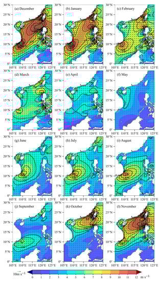 The monthly mean distribution of wind (shaded, vector, and unit: m·s−1) and wind power density (contour, unit: W·m−2) over the SCS from 1979 to 2021.