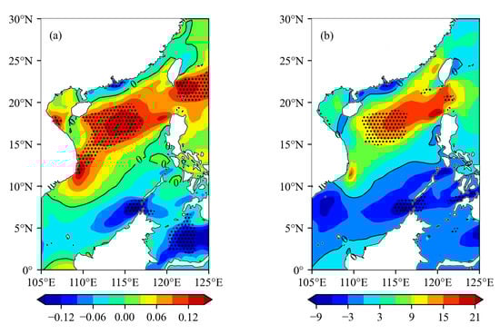 The linear variation trends of the annual mean wind ((a), unit: m·s−1·(10a)−1) and wind power density ((b), unit: W·m−2·(10a)−1) over the SCS from 1979 to 2021. The black dots indicate the significant areas with more than a 95% confidence level (which was achieved by using Student’s t-test).