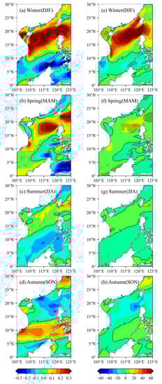 The linear variation trends of the seasonal mean wind ((a–d), unit: m·s−1·(10a)−1) and the wind power density ((b–h), unit: W·m−2·(10a)−1) over the SCS from 1979 to 2021. The black dots indicate the significant areas with more than a 95% confidence level (which was achieved through using Student’s t-test). Moreover, (a,e): winter; (b,f): spring; (c,g): summer; and (d,h): autumn.
