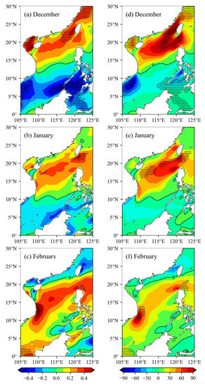 The monthly mean wind and wind power density over the SCS during 1979–2021 are displayed in Figure 7, Figure 8, Figure 9 and Figure 10. From December to February (Figure 7), the increasing trends of wind (Figure 7a–c) and wind power density (Figure 7d–f) over the central SCS move gradually to the southern SCS. Meanwhile, the increasing trends along the northern coast of the SCS change to decreasing trends. Furthermore, the decreasing trends strengthen greatly and become significant in February along the western coast of Guangdong. When compared with the trends in winter (Figure 6a,e), it can be found that the decreasing trends of the wind speed and wind power density along the northern coast of the SCS are mainly as a result of the decreasing trends in February.