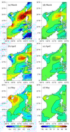 As in Figure 7, but for March (a,d), April (b,e), and May (c,f).