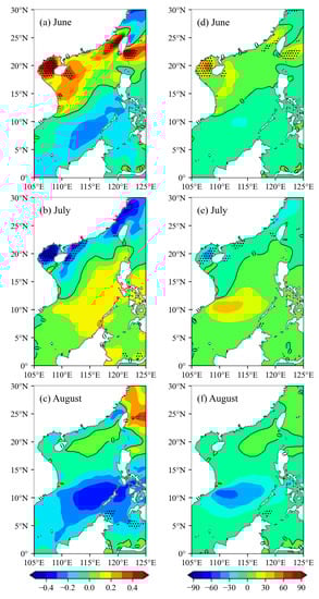 As in Figure 7, but for June (a,d), July (b,e), and August (c,f).