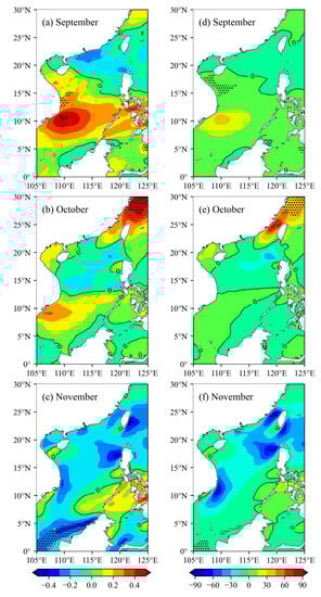 As in Figure 7, but for September (a,d), October (b,e) and November (c,f).