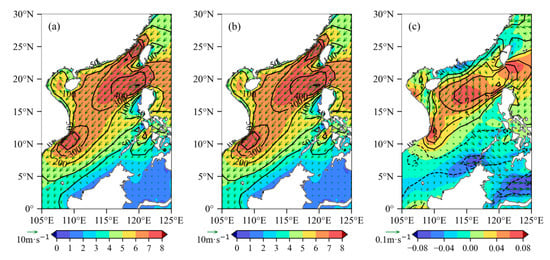 The annual mean distribution of wind (shaded, vector, unit: m·s−1) and wind power density (contour, unit: W·m−2) over the SCS in 2021 (a), the next 5 years (b), and their differences between the next 5 years and 2021 (c).