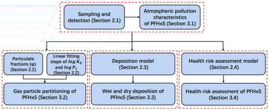 The methodology chart is shown in Figure 1. The experiment is discussed in Section 2.1 and the atmospheric concentrations of PFHxS obtained are analyzed in Section 3.1. The methods used to calculate the particulate fraction (φ) and the linear fitting slope of and of PFHxS are described in Section 2.2, while those used to assess the gas–particle partitioning of PFHxS are described in Section 3.2. The deposition models are introduced in Section 2.3 and applied in Section 3.3 for the discussion of the wet–dry deposition flux of PFHxS in each month. Health risk assessment models are interpreted in Section 2.4 and used in Section 3.4 to assess the health risk of PFHxS. Some abbreviations that were used in this study are shown in Table S1.