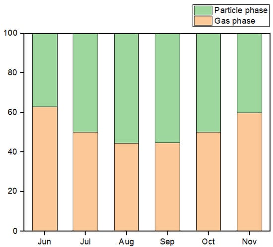 During the monitoring period, the particulate fraction (φ) of PFHxS was 0.48 ± 0.08, which was comparable to that of Beijing (0.65 ± 0.13) in 2013 [23] and Xiamen (0.41 ± 0.14) in 2019 [22]. Figure 2 shows the gas and particulate fractions of PFHxS from June to November 2021. During this period, the φ initially increased and then decreased. The lowest value of φ in June was 36.9%, and then it gradually increased until it peaked at 55.6% in August. After that, it began to decrease and finally reached the lowest value of 40.0% in November. In terms of seasons, the temperature during summer, from June to August, rose gradually. In autumn, the temperature declined. There was a significant positive correlation between the φ and temperatures. The higher the temperature was, the easier it was for PFHxS to partition in the particle phase. With the decrease in temperature, it was easier to distribute in the gas phase.