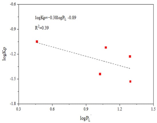 The and values were linearly fitted, and the results are shown in Figure 3. The linear regression slope value m was −0.381. It should be noted that our sample size was limited and the linear relationship between and was not strong enough (R² = 0.39). Therefore, the calculated slope m may be not representative enough, and the related discussion about gas–particle partitioning characteristics of PFHxS was preliminary with certain uncertainties. When |m| is close or equal to 1, the partitioning of POPs between the gas phase and the particle phase is in equilibrium [31,40]. In this study, |m| deviated from 1, so PFHxS could not reach the equilibrium state. Moreover, slopes shallower than −0.6 point to the absorption between POPs and the particulate matter [41]. The m in this study was bigger than −0.6, which indicated that the absorption probably dominated the partitioning process.
