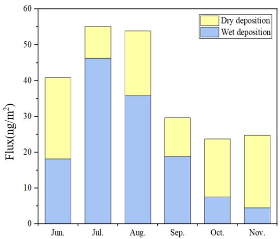 The monthly mean wet deposition flux of PFHxS was 21.8 ± 16.2 ng/m2, which is equivalent to that of Fuxin (8.40 ng/(m2 d) and Weifang (12 ng/(m2 d), but lower than that of Xingtai (34 ng/(m2 d) [42]. The wet deposition in July contributed the most, accounting for 35% of the half-year deposition flux, followed by August and September. The monthly rainfall totals in July, August, and September were higher than 200 mm, significantly larger than that in other months (Table S4), and the average monthly PFHxS concentration was relatively high. Therefore, more rainfall washed PFHxS in the atmosphere, resulting in higher monthly deposition flux than in other months. In November, the monthly average concentration of PFHxS was high, but the wet deposition flux was the lowest, which was mainly due to the sharp decrease in rainfall in November. The rainfall in other months and the atmospheric concentrations of PFHxS were relatively low, so the wet deposition flux was low. To sum up, the rainfall and atmospheric concentrations of PFHxS were the main factors that affect the monthly wet deposition flux of PFHxS.