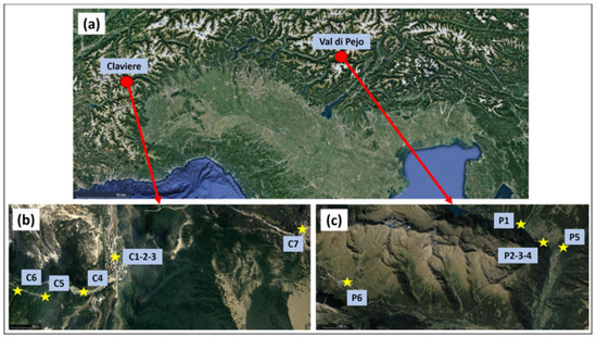 (a) Sampling locations; (b) Claviere samples; (c) Val di Pejo samples.