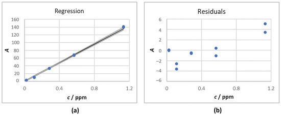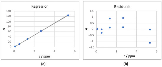 The linearity of the calibration curve was evaluated using the lack-of-fit test (alpha 0.01, ISO 11095:1996), Mandel’s test (alpha 0.01, ISO 8466-1:2001), and the 5%-interval test (EN 15984:2022). The aforementioned tests yielded positive results. Moreover, the R2 value was 0.9999 and the cross-validated R2 was 0.9999.